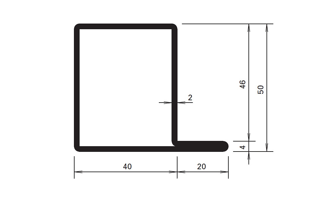 Yksihuulinen oviprofiili, L-profiili. Profiilin L-huulen korkeus: n. 20 mm